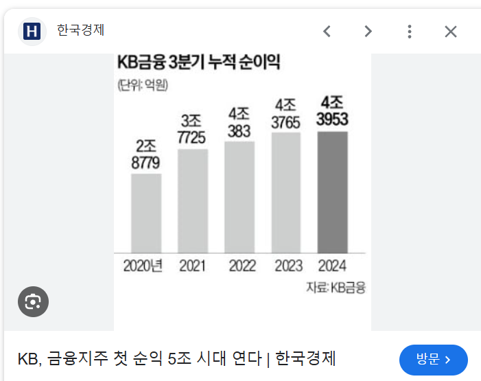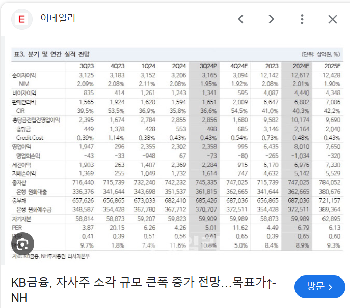 - 안정적인 실적: 2024년 3분기 KB금융은 비교적 안정적인 실적을 기록했지만, 금리 인하와 경기 둔화의 영향으로 순이자마진(NIM)이 하락했습니다.